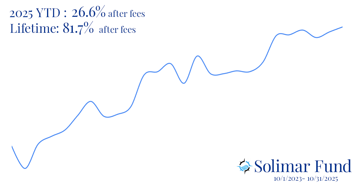 Solimar Fund has returned 26.6% after fees in 2025 (1/1/25-10/31/25).